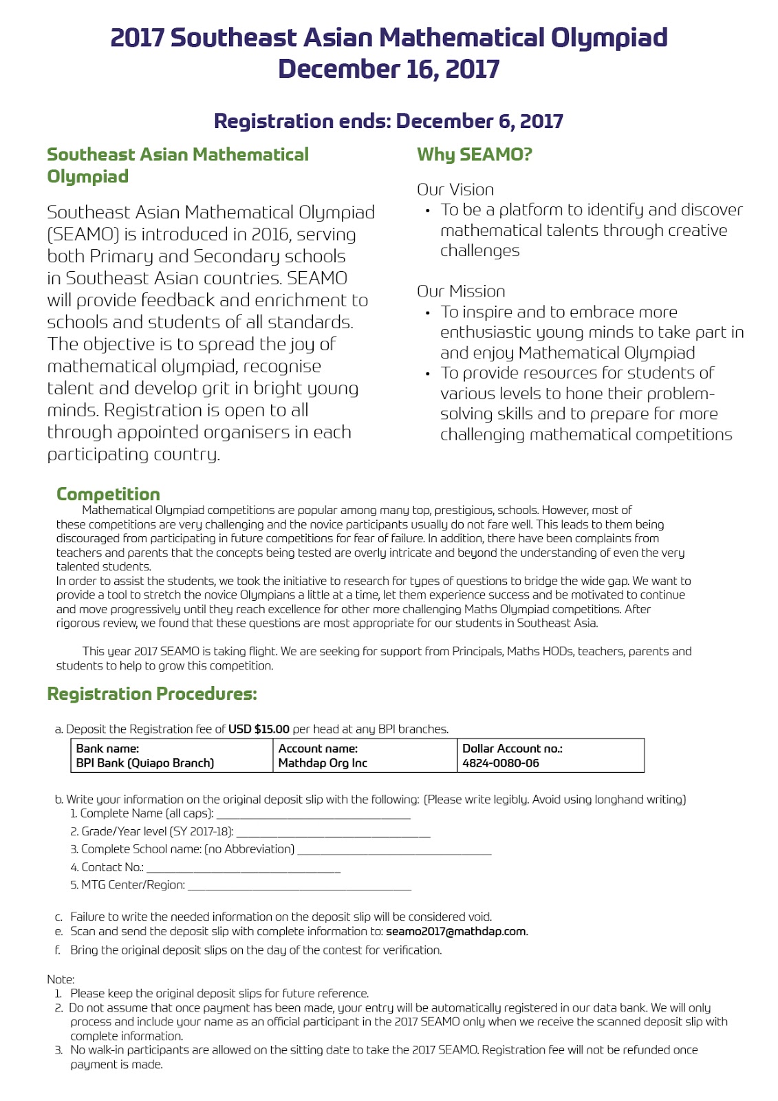 The MathDAP, in the last few weeks, has been receiving countless emails, text messages and even calls requesting for the extension SEAMO registration deadline until next month, thus the due date of registration is moved to December 6, 2017.